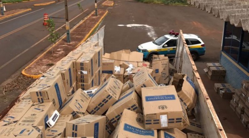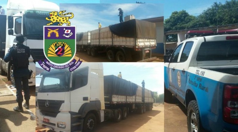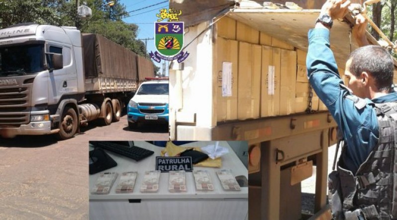 Policiais Militares da Patrulha Rural apreendem carreta com 40 mil pacotes de cigarros.