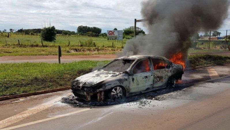Em Bandeirantes, carro é consumido por fogo na BR-163