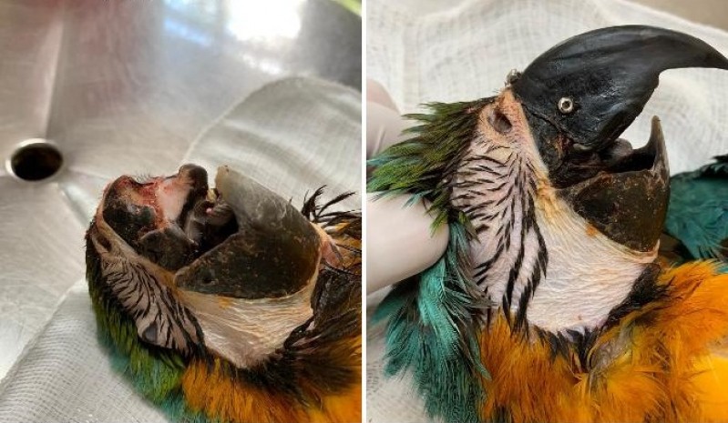 Em cirurgia de 1h30, arara-canindé mutilada recebe transplante de bico
