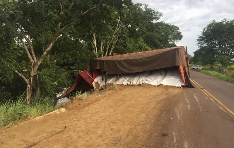 Na MS-080, Carreta bitrem com osso triturado tomba em curva, atinge carro e para em barranco