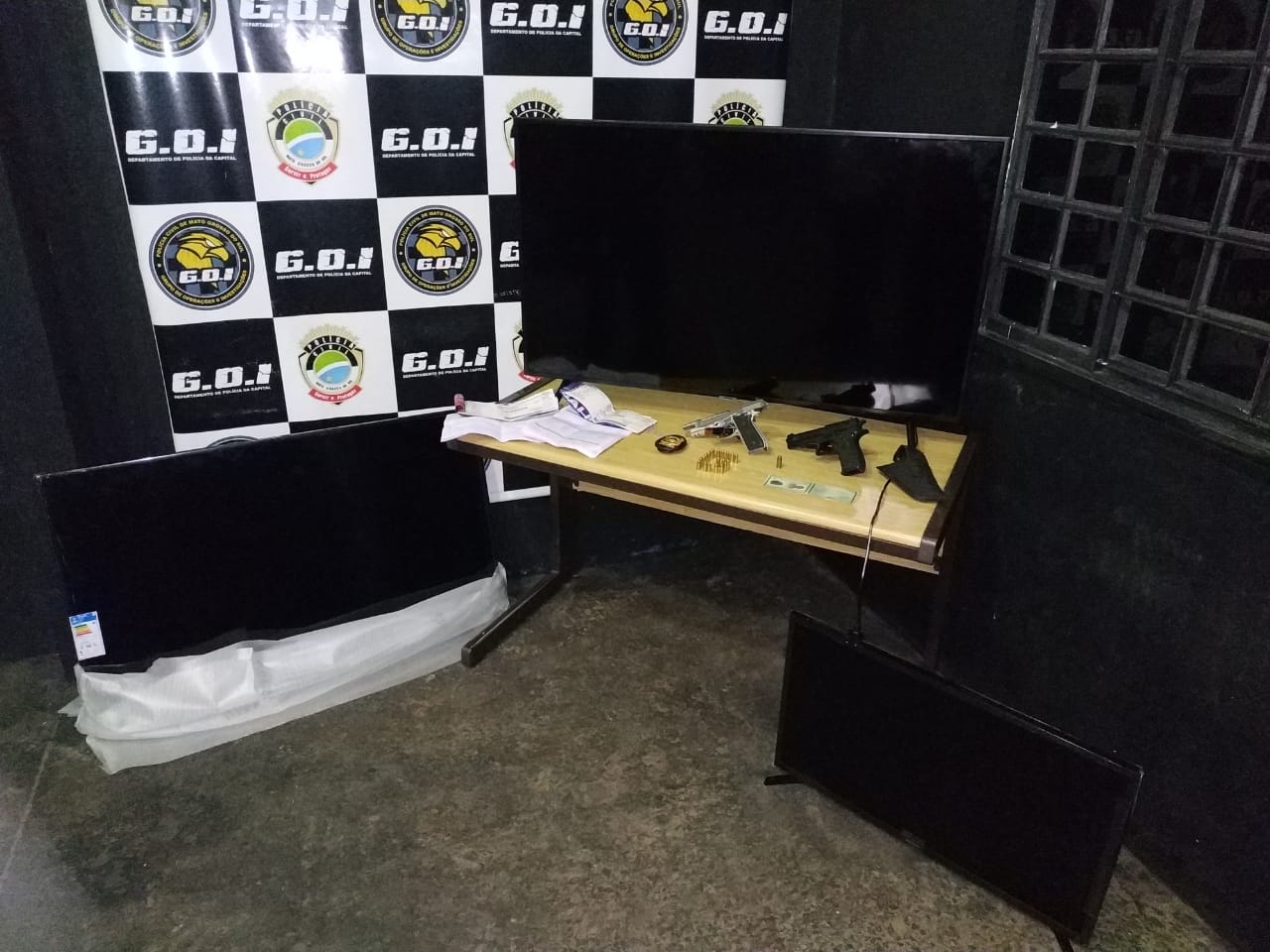 Na casa de JALLYSON (vulgo Jájá) foi encontrado uma televisão de 50 polegadas comprada em nome do militar, uma pistola calibre 380, munição de calibre .45, um simulacro e diversos documentos.
