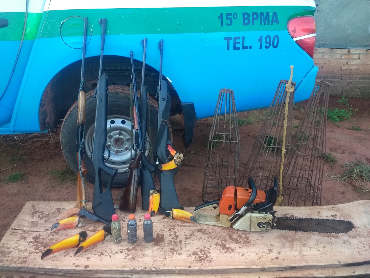 O infrator confessou os crimes e dentro da casa dele ainda foram encontradas seis cabeças de tucano que o assentado havia abatido, além de quatro rifles de caça calibre 22 e 126 munições do mesmo calibre, uma espingarda calibre 28 e dois cartuchos carregados do mesmo calibre. Todo o armamento estava sem documentação. A madeira, motosserra, armadilhas, armas e munições foram apreendidos.