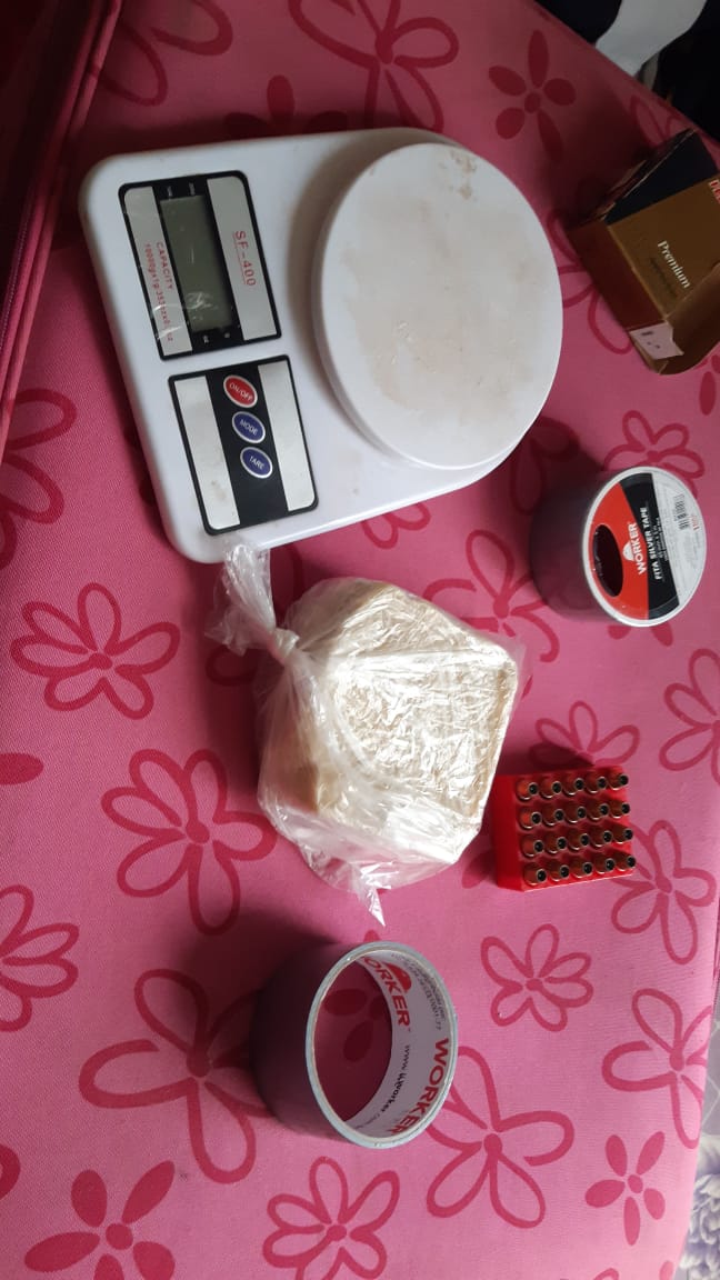 Diante da notícia de que vendia entorpecentes, foi realizada vistoria no imóvel e em um quarto dos fundos foi localizado um tablete de pasta-base de cocaína, pesando 500 gramas, além de 20 munições de calibre .40, bem como balança de precisão e o veículo do suspeito foragido.