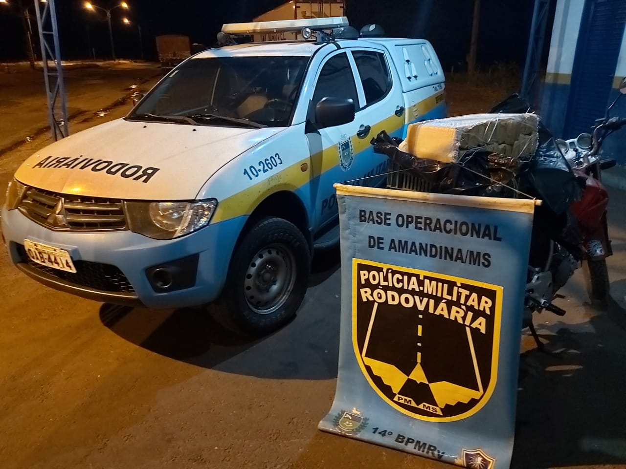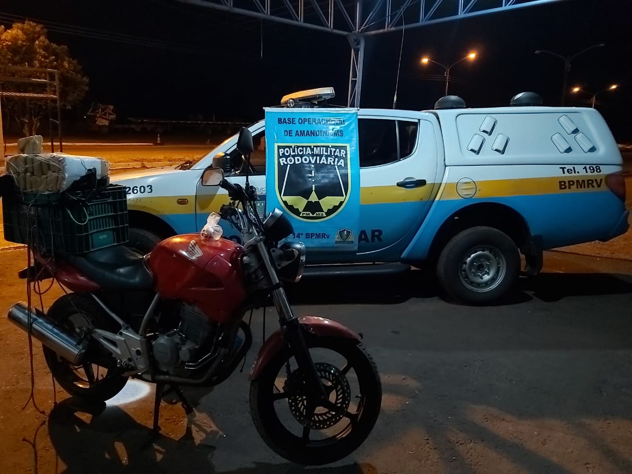 A ação ocorreu na BR 376, quando a equipe da Polícia Militar Rodoviária realizava policiamento ostensivo, deu ordem de parada à motocicleta Honda/CBX Twister com placas de Juti – MS, que trafegava no sentido Ivinhema X Nova Andradina. Ao vistoriar o conteúdo de uma caixa plástica na garupa da moto, a equipe da PMR se deparou com 72 tabletes de maconha. O autor, que utilizava tornozeleira eletrônica, não possuía CNH e informou que levaria a moto de Itaquiraí para Bataguassu pela quantia de 1,5 mil reais e que está respondendo pelo crime de receptação.
