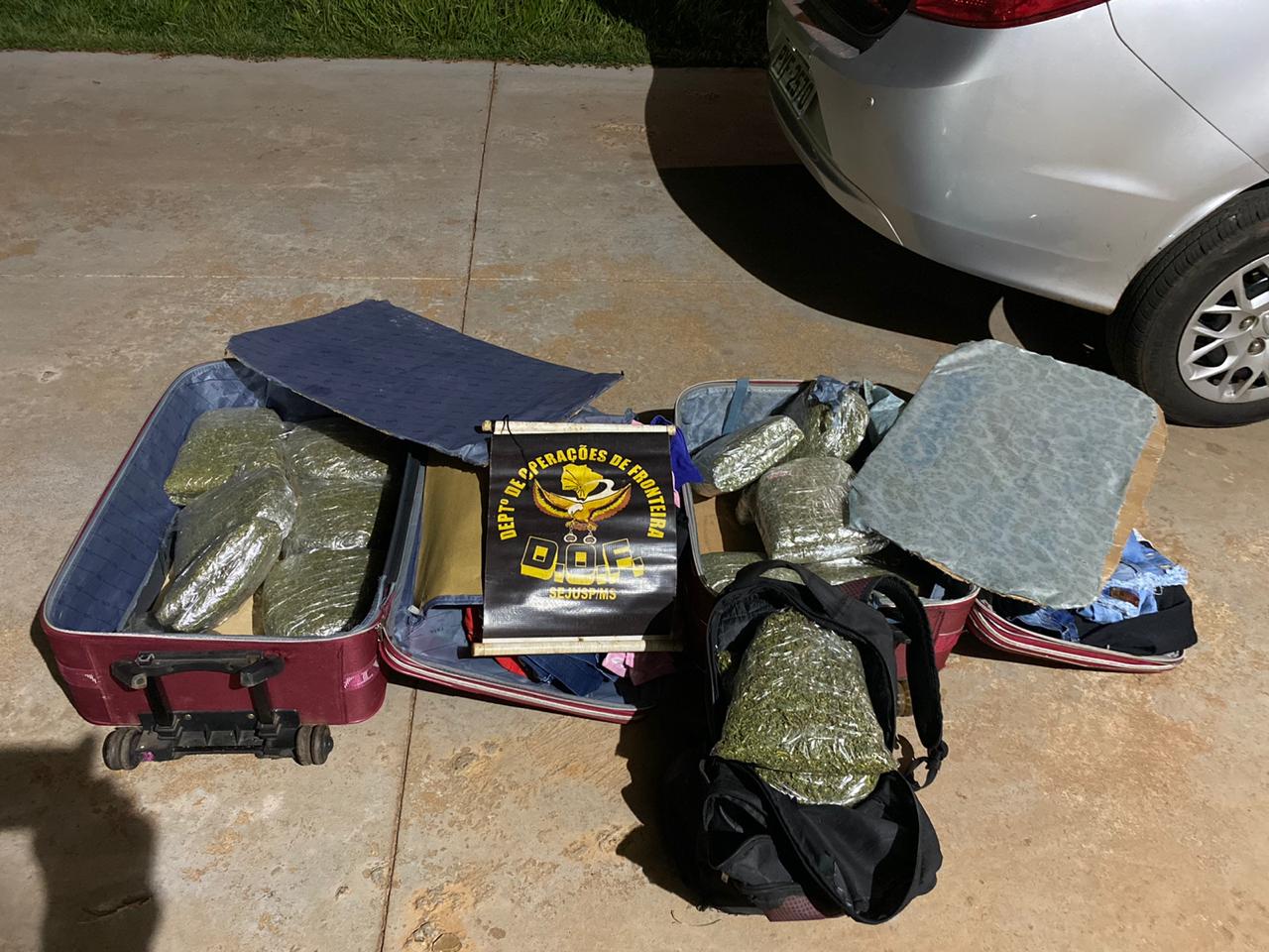 Policiais Militares do Departamento de Operações de Fronteira (DOF) prenderam, na noite de ontem, uma mulher de 26 anos de idade e apreenderam um adolescente de 17, que transportavam 12,5 Kg de Skank para o Estado de São Paulo. A ação policial ocorreu em virtude da Operação Hórus, do Ministério da Justiça e Segurança Pública, durante o policiamento ostensivo na zona rural, região de Ivinhema.