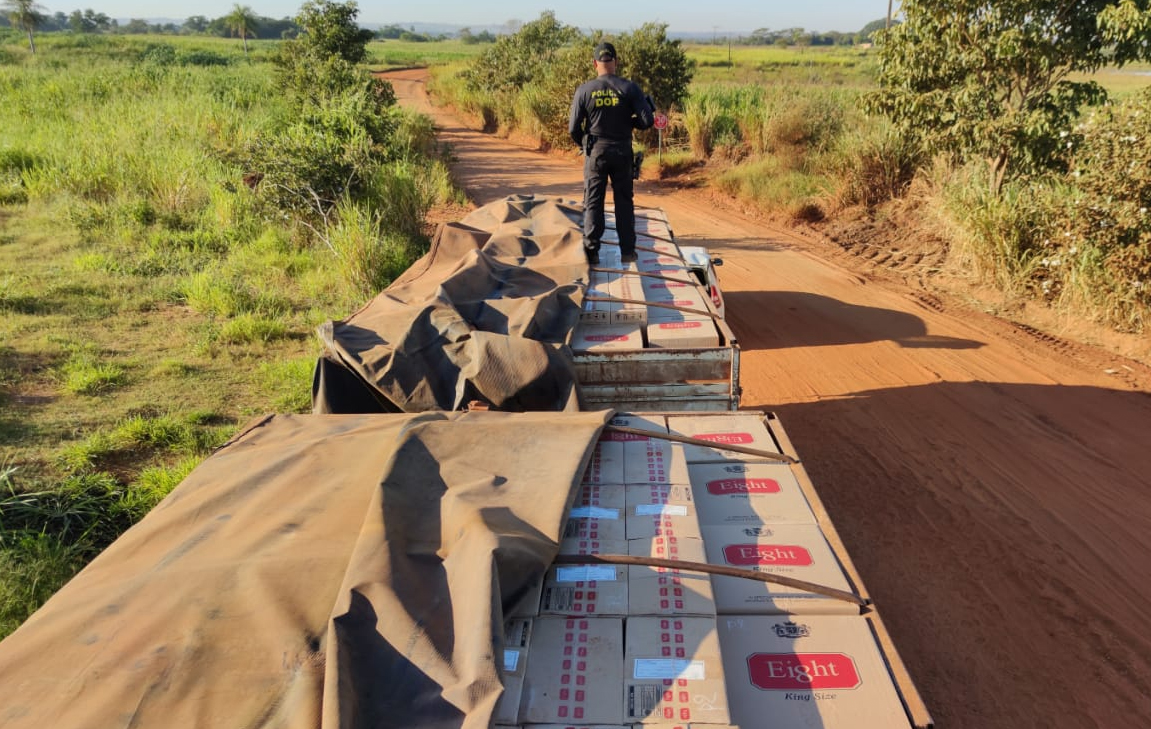 Policiais Militares do Departamento de Operações de Fronteira (DOF) apreenderam, na manhã de sábado(09), um caminhão Mercedes-Benz acoplado a um semirreboque carregado com 46.700 pacotes de cigarros contrabandeados do Paraguai. A ação ocorreu em virtude da Operação Hórus, do Ministério da Justiça e Segurança Pública, durante um deslocamento policial na Rodovia BR-463, município de Itaquiraí.