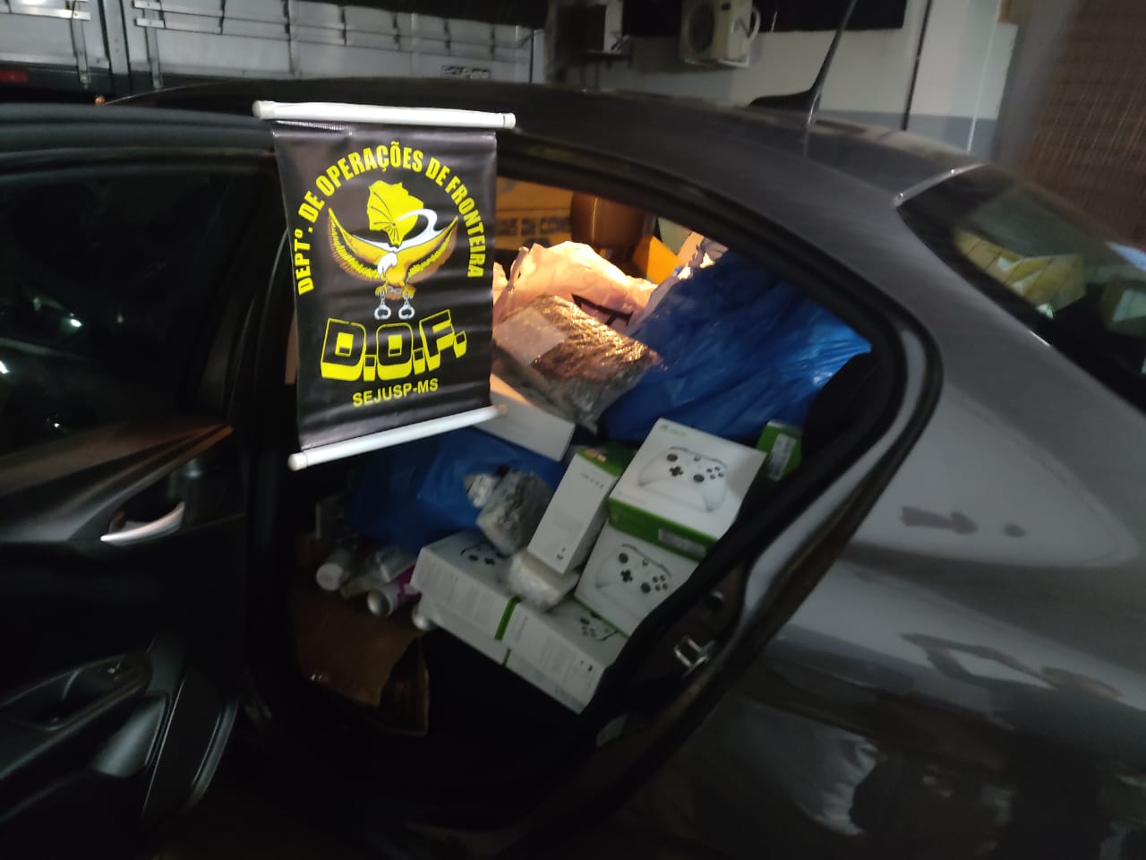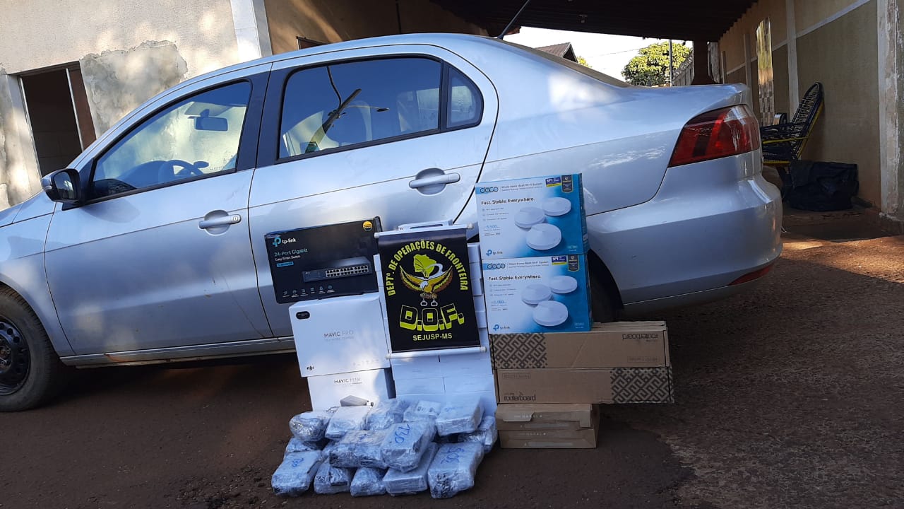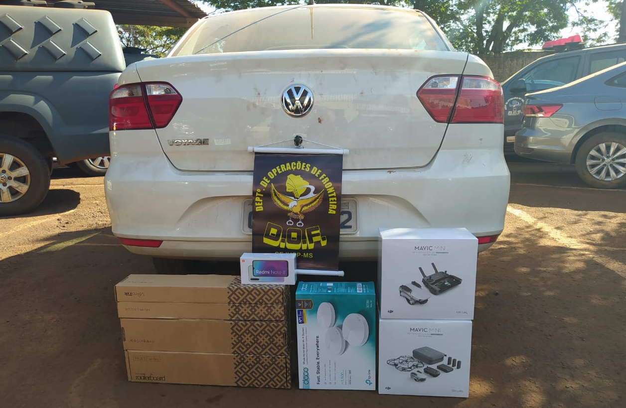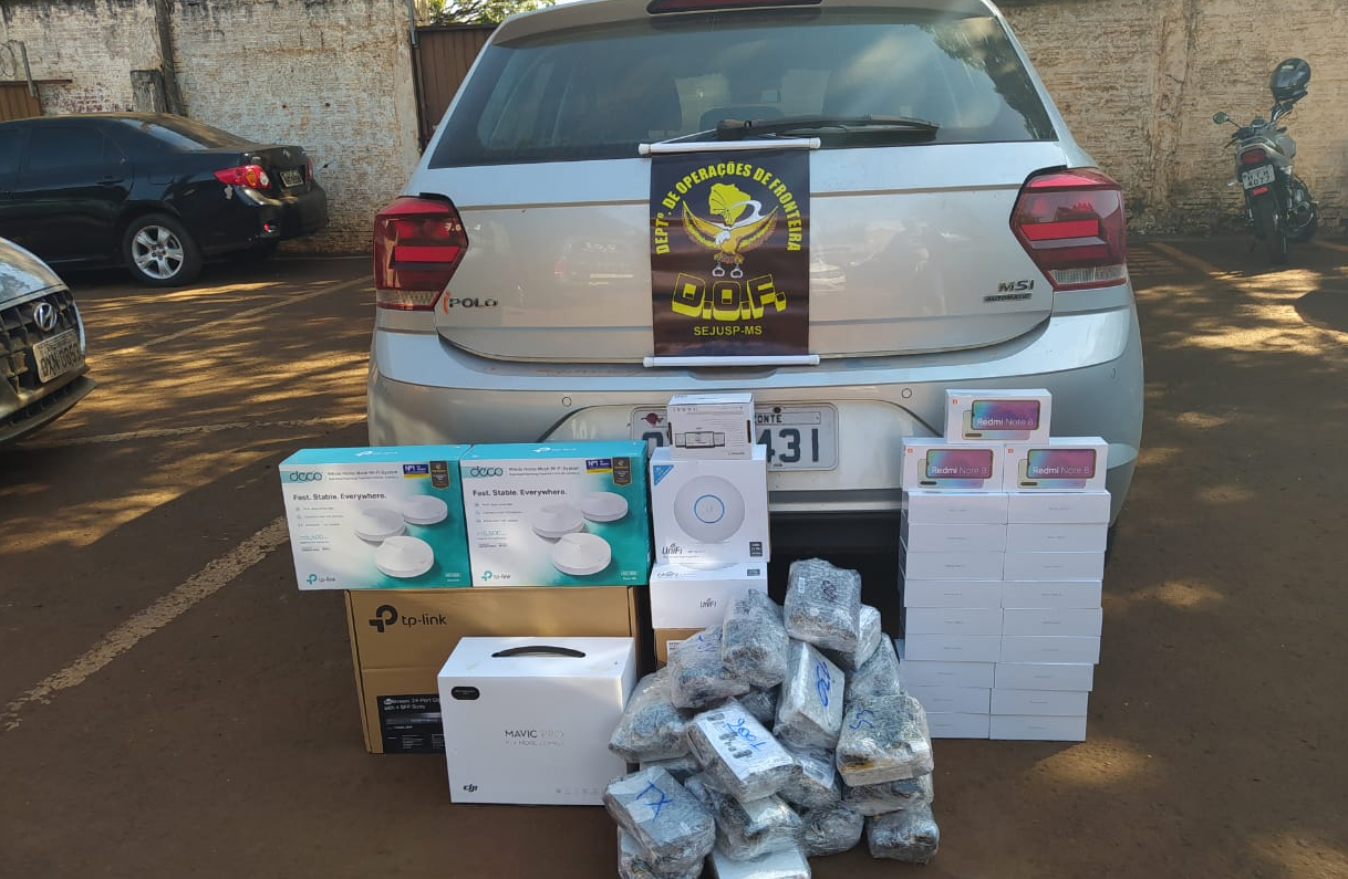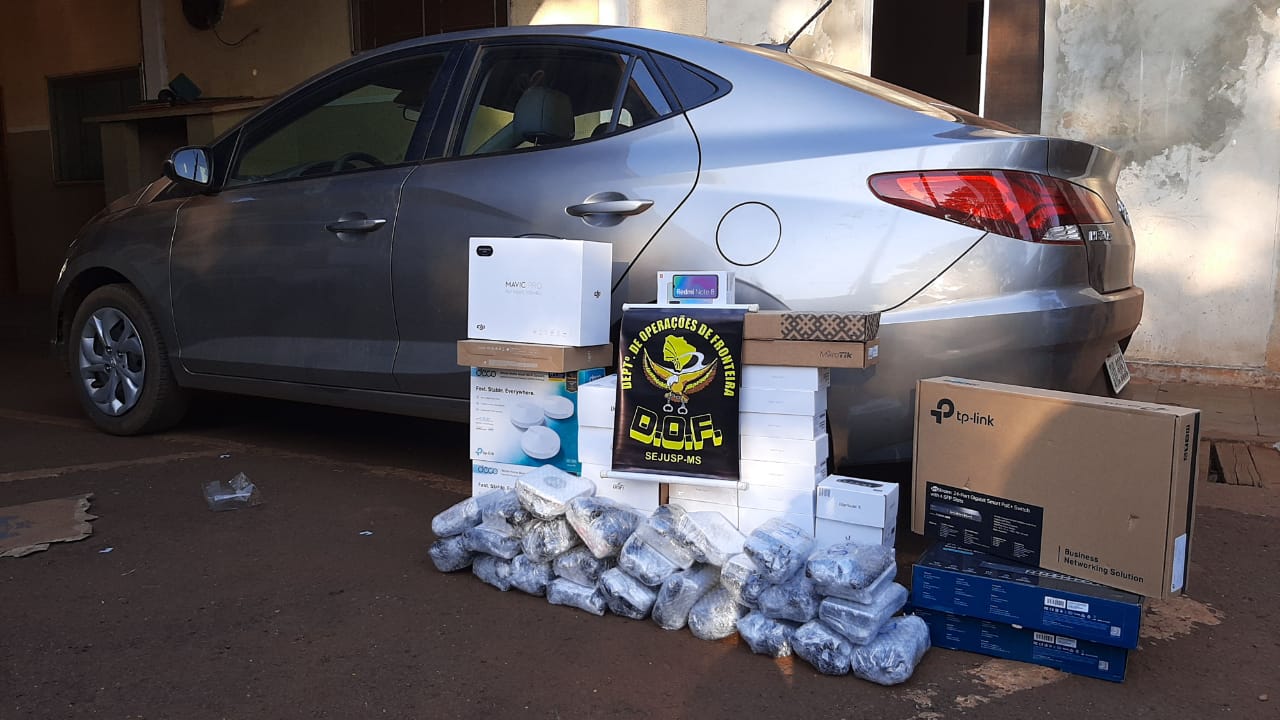 Nos 15 veículos foram apreendidos: 341 aparelhos de telefone celular da marca Xiaomi Note 8 e 9; 138 roteadores; 7 drones; 131 receptores para TV; 840 pacotes de essência para narguilé; 3 volumes de óculos; 12 fardos prensados de roupas e jaquetas; 13 volumes de relógios; 2 caixas de acessórios para telefone celular; 66 aparelhos de telefone da marca iPhone; 350 pacotes de cigarros; 2 volumes grandes de isqueiros; 90 modens; e, 115 frascos de perfumes. O material apreendido foi avaliado em dois milhões de reais.