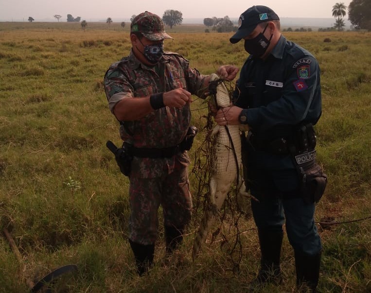 Policiais Militares Ambientais de Naviraí receberam informações de que havia um jacaré fisgado em um anzol armado em uma lagoa marginal ao rio Amambai, a 5 km da cidade hoje (15) à tarde. Uma equipe foi rapidamente ao local e confirmou a denúncia, verificando que se tratava de um animal silvestre da espécie jacaré-do-papo-amarelo preso ao anzol com linha.