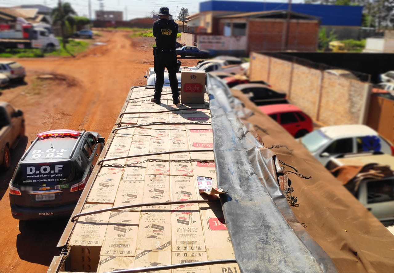 Policiais Militares do Departamento de Operações de Fronteira (DOF) apreenderam, na manhã de ontem(25), uma carreta baú de cor branca com placas de Abelardo Luz (SC) carregada com 42.500 pacotes de cigarros de origem estrangeira, sem a documentação de regularidade fiscal.