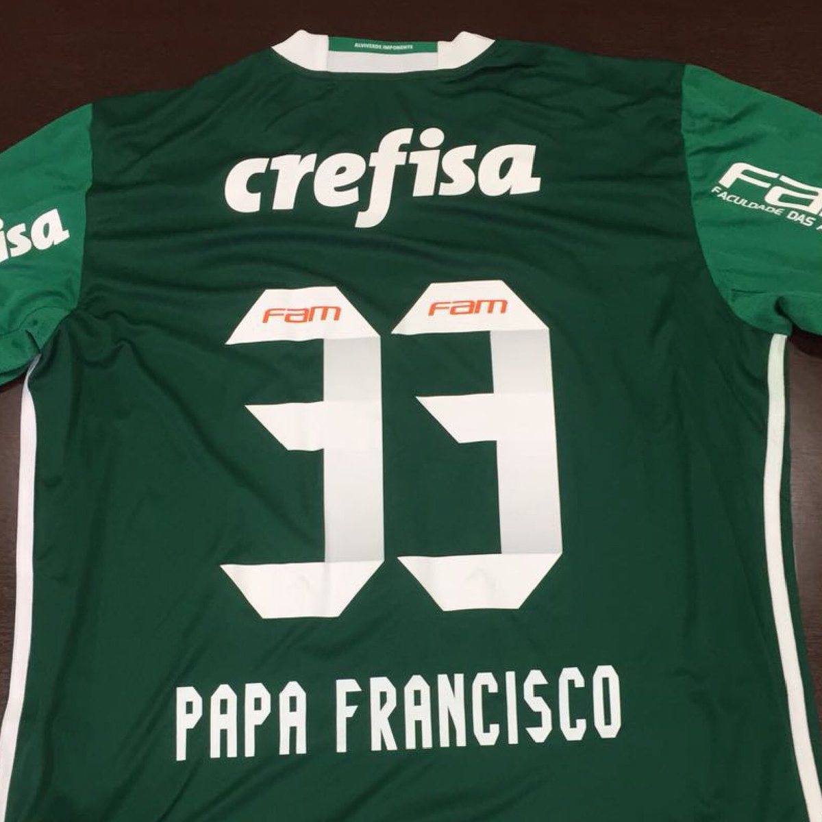 O Palmeiras postou nesta quarta-feira, em sua conta no Twitter, uma foto do Papa Francisco recebendo no Vaticano uma camisa do clube, com o número 33, o mesmo que era usado por Gabriel Jesus, atacante que se transferiu para o Manchester City após a conquista do título brasileiro no fim do ano passado. O atacante nunca escondeu que o 33 era uma homenagem à idade de Cristo. É o mesmo número, aliás, que ele pediu para usar no clube inglês.