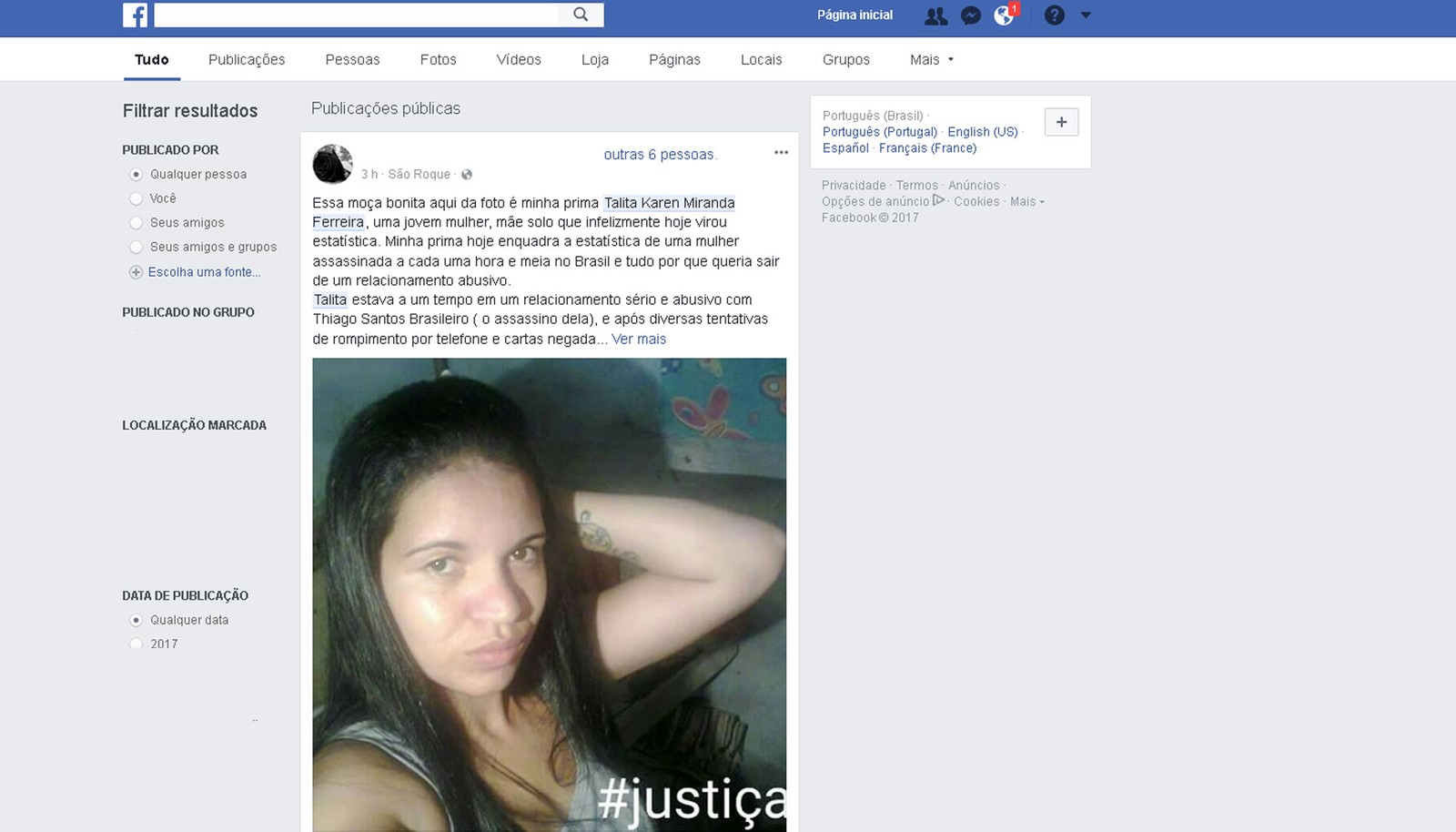A família de Talita está abalada com o ocorrido. Uma das primas da jovem disse, em uma página de rede social, que Talita "infelizmente hoje virou estatística."
