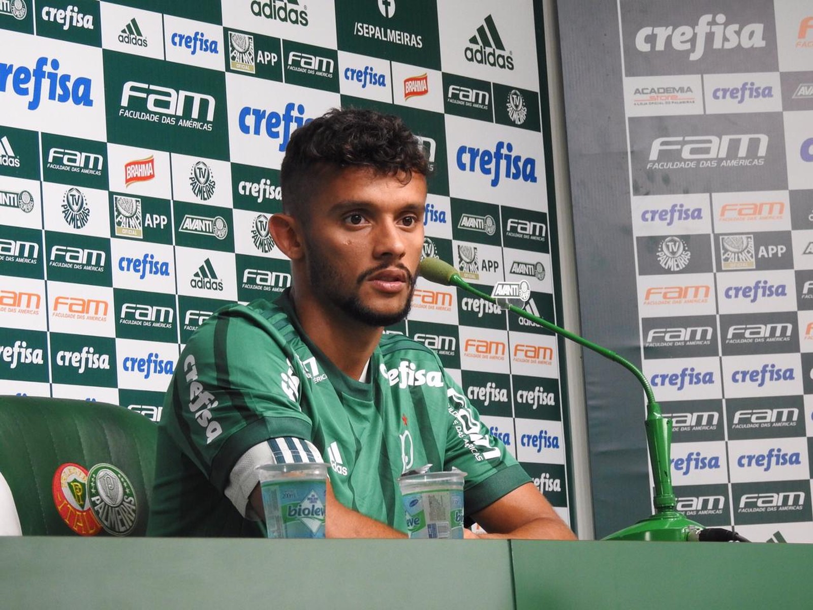 Gustavo Scarpa durante a entrevista coletiva no Palmeiras (Foto: Tossiro Neto)