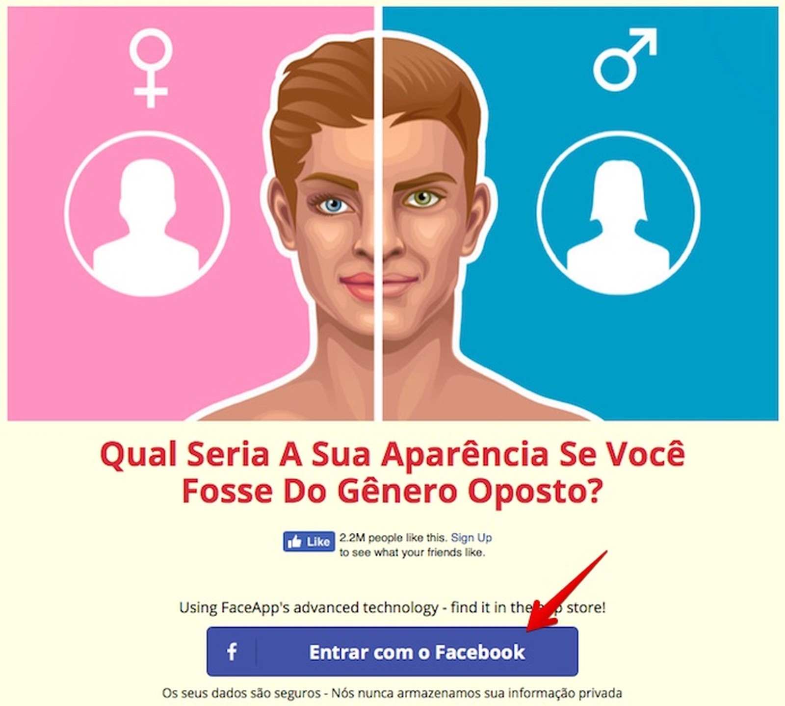 O teste "Qual seria sua aparência se você fosse do gênero oposto" está fazendo sucesso no Facebook nos últimos dias. O site que faz a brincadeira usa dados e foto de perfil da rede social para criar uma montagem do seu rosto, simulando alguém de outro sexo. O resultado, então, pode ser compartilhado com os amigos, na linha do tempo. Se preferir, o usuário pode baixar o aplicatico FaceApp para celular, da mesma empresa criadora do teste, para criar outras transformações.
