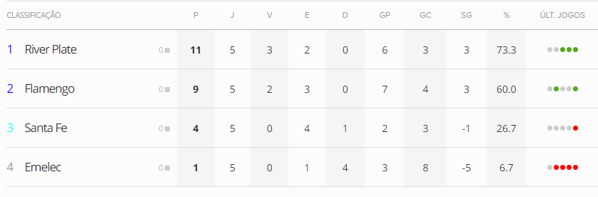 Foto: Globo Esporte DISPUTA PELA LIDERANÇA NA ÚLTIMA RODADA Com a vitória, o Flamengo chegou a 9 pontos e segue em segundo lugar no Grupo 4. Na próxima quarta-feira, decidirá contra o River Plate, na Argentina, a liderança do grupo e a vantagem de fechar em casa o confronto das oitavas de final. HERÓI DA NOITE Éverton Ribeiro foi o herói da classificação. O meia foi o melhor do Flamengo na partida e marcou os dois gols da vitória. No primeiro, pegou rebote e afundou as redes. No segundo, cobrou falta colocada, sem chances para o goleiro Dreer. Nas comemorações, homenageou o nascimento do filho Augusto, colocando o dedo na boca simulando uma chupeta. Éverton Ribeiro Foto: Globo Esporte NOS BRAÇOS DA TORCIDA O jogo marcou o reencontro do Rubro-Negro com sua torcida na competição. Nas duas primeiras rodadas com mando de campo, a equipe jogou com portões fechados para cumprir suspensão pela confusão na final da Sul-Americana. Nesta quarta, foram 36.754 pagantes e 40.390 presentes no Maraca.