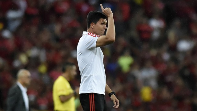 Foto: Globo Esporte BARBIERI EXPULSO Maurício Barbieri foi expulso pela arbitragem aos 12 minutos do 2º tempo por excesso de reclamação. Quem comandou o Flamengo no restante da partida foi o auxiliar Mauricinho. Foto: Globo Esporte 1º TEMPO O jogo começou franco, com ambas as equipes se lançando para frente e dando margens para contra-ataques. A primeira chance foi do Fla, com Vinicius Jr., aos 5 minutos. O Emelec respondeu logo depois, em chute de Preciado que explodiu na zaga.